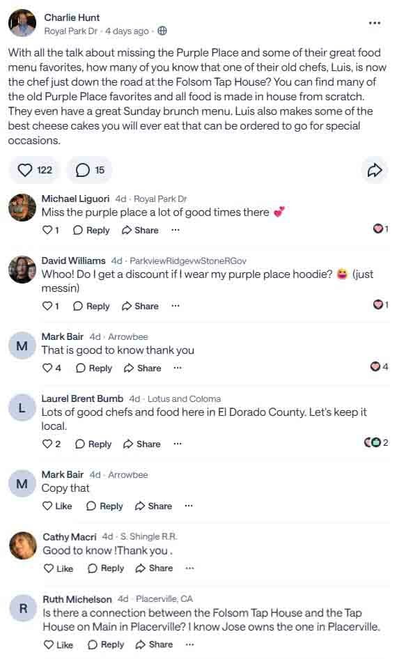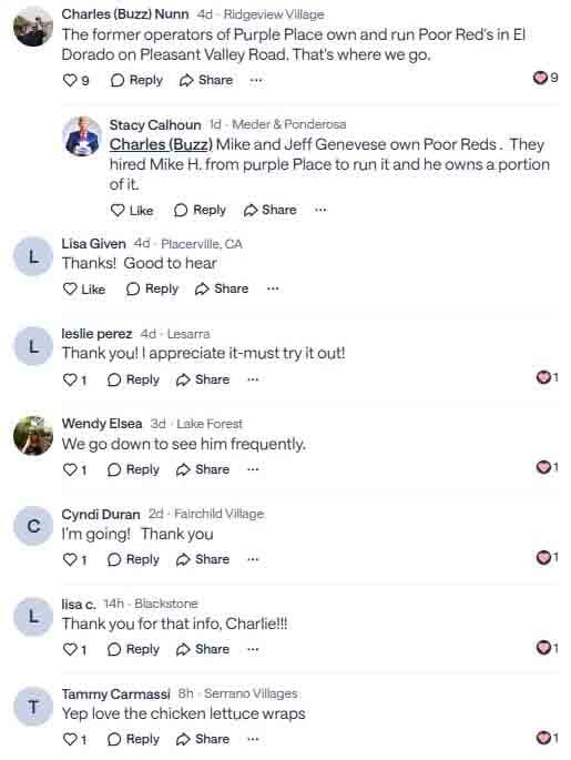 The post sparked plenty of nostalgic memories and food tips from neighbors—some recommending Poor Red’s in El Dorado (run by the Purple Place’s former operators) and others reminding us that El Dorado County is full of talented chefs worth supporting. Whether it’s rediscovering old favorites or trying something new, the conversation was a warm reminder that our community’s food scene has deep roots and plenty of flavor. 💖