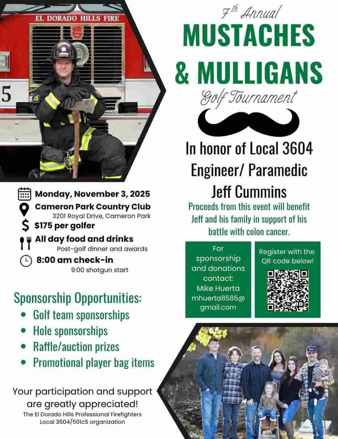 This fall, the EDH Firefighters are rallying the community for the 7th Annual Mustaches & Mulligans Golf Tournament, held in honor of Engineer/Paramedic Jeff Cummins, who is bravely facing a battle with colon cancer.