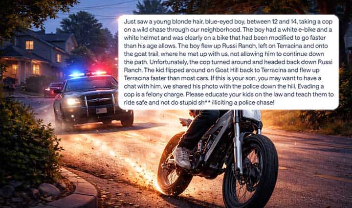 It started as an evening walk through the neighborhood, the kind of quiet routine families here have done for years. Then came the sirens. Then the blur of a white e-bike, a young boy no older than 14, flying past with a police cruiser in pursuit. The scene unfolded on streets where children play and families stroll. A boy on a modified bike, racing up Russi Ranch, cutting onto the goat trail, speeding back faster than most cars travel that road.